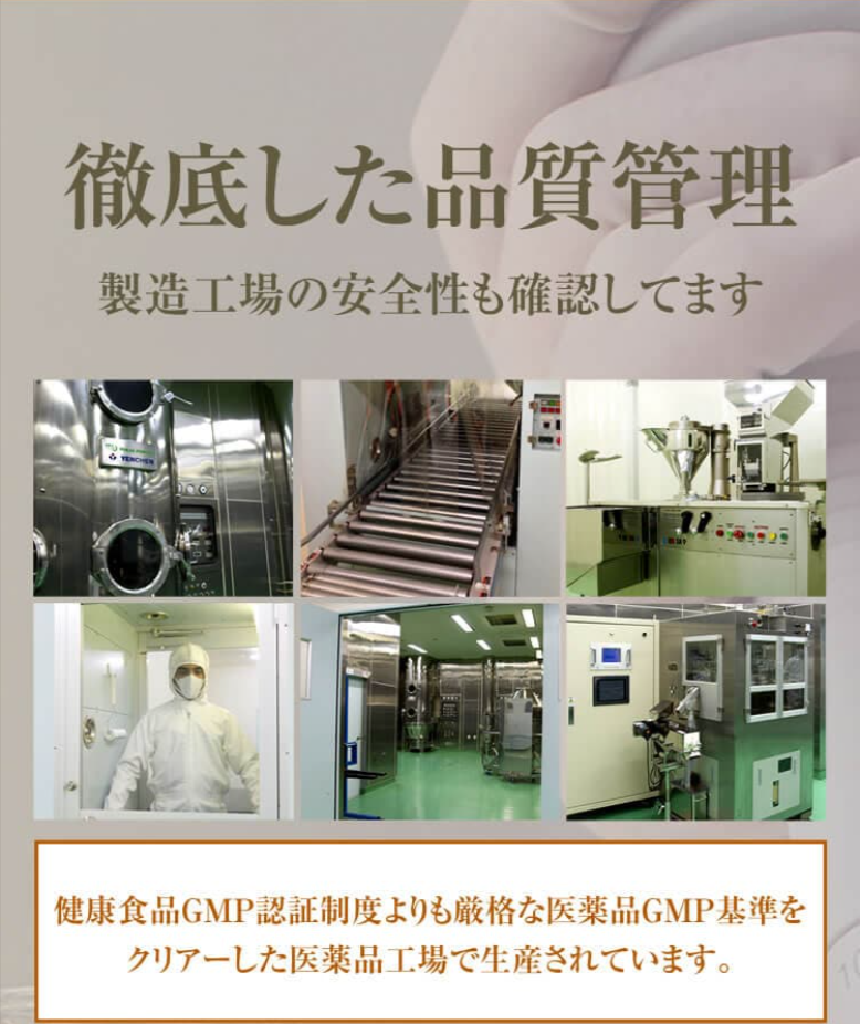 健康食品GMP認証よりも厳格な医薬品GMP基準をクリアした医薬品工場で生産されています。
