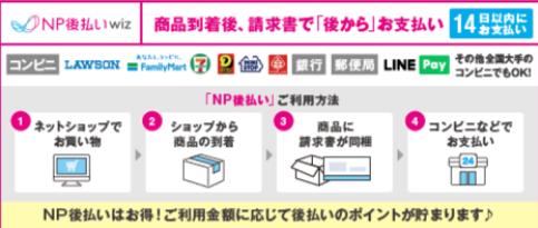 NP後払い: 商品が到着し、中身を確認してから、コンビニ・郵便局・銀行・LINE Payなどで支払いができるため、