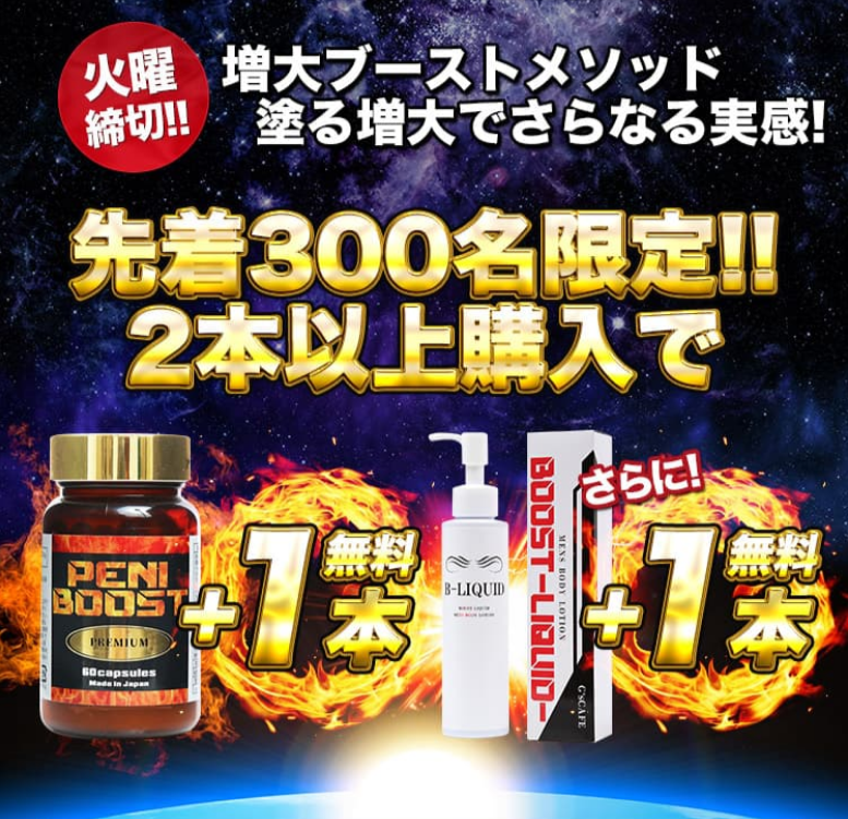 特典: 2本セット以上の購入に該当するため、さらにペニブーストプレミアムが1本無料+BOOST LIQIDプレゼントとなります。
